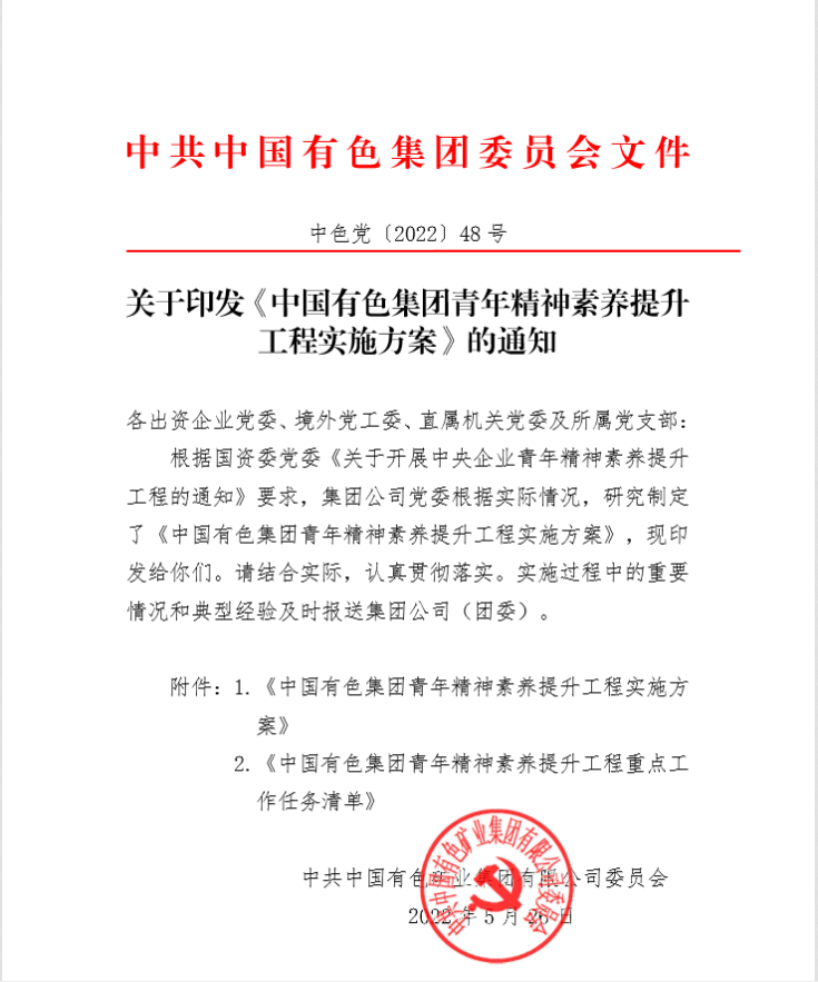 關于印發《中國有色集團青年精神素養提升工程實施方案》的通知