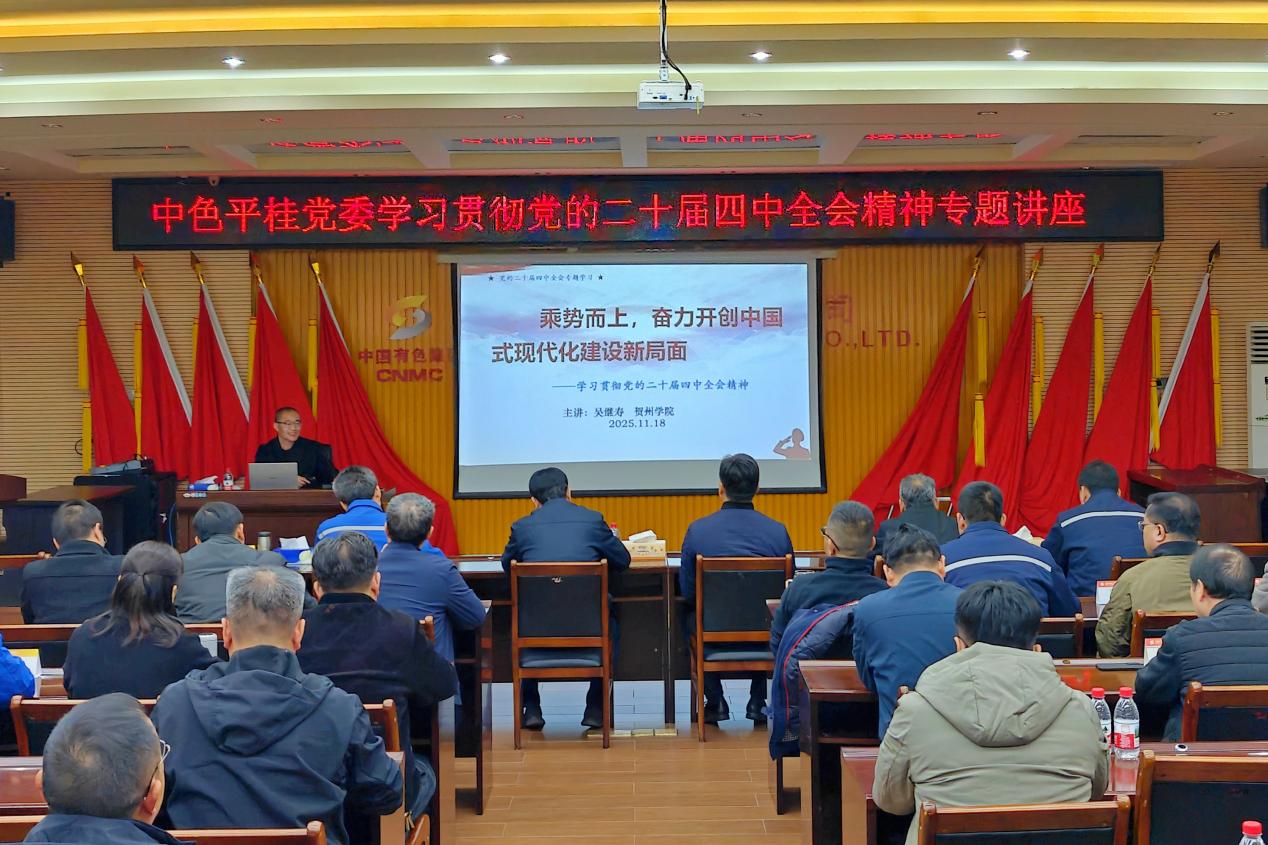 為深入學習貫徹黨的二十屆四中全會精神,11月18日,中色平桂黨委舉辦學習貫徹黨的二十屆四中全會精神專題講座,邀請賀州學院馬克思主義學院教授、自治區“雙進”教育宣講團成員、賀州市委“二十屆四中全會精神學習”“習近平談治國理政第五卷精神學習”宣講團成員吳繼壽作專題宣講。